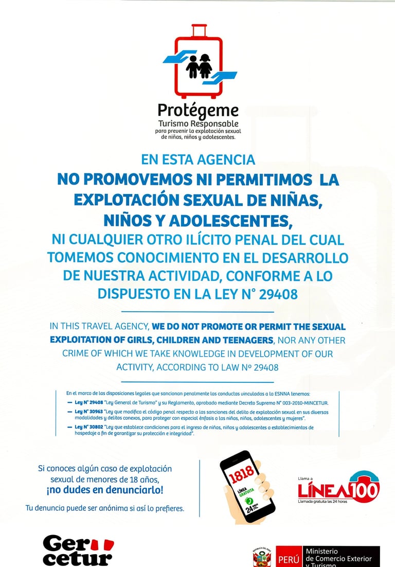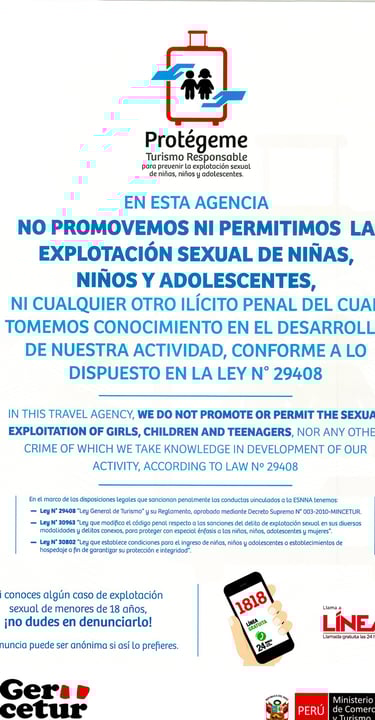 En Suri Travel Cusco, reafirmamos nuestro firme compromiso con la prevención de la Explotación Sexual de Niñas, Niños y Adolescentes (ESNNA) en el ámbito del turismo.